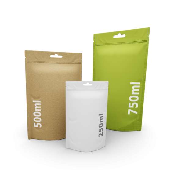 Ein wesentlicher Teil unseres Standbodenbeutel-Sortiments sind unsere Doypacks in festen Formaten. Diese zeichnen sich durch ihre vordefinierten Größen aus. Sie lassen sich also ohne eigenes Ausmessen schnell und einfach anwenden. Je nach Produkt, dass du verpacken möchtest, eignen sich die unterschiedlichen Beutelmaße mal mehr und mal weniger. Vor allem für Produkte, die auf einmal verbraucht werden, sind kleine Standbodenbeutel sehr gut geeignet. Für Produkte wie Hundefutter oder Whey-Protein, sind größere Beutel besser geeignet, da es sich hierbei um Produkte handelt die über einen längeren Zeitraum hinweg verbraucht werden.