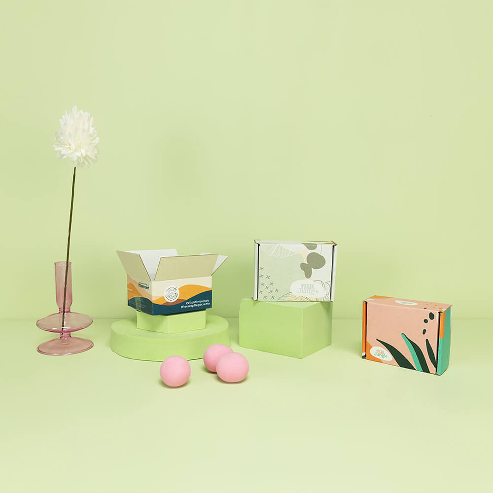 Con le nostre scatole personalizzate in cartone riciclato, cartone in erba e cartone naturale, troverai tre varianti di materiale nella nostra gamma che garantiscono una protezione affidabile, supportando inoltre l'immagine sostenibile dei cosmetici naturali. Grazie a diversi design, packaging warehouse offre scatole personalizzate in cartoncino per varie forme di presentazione dei prodotti: